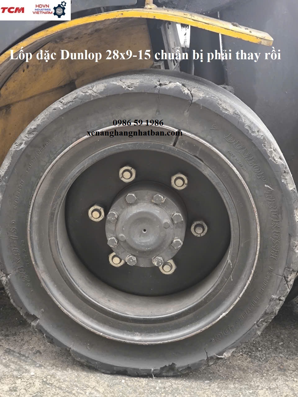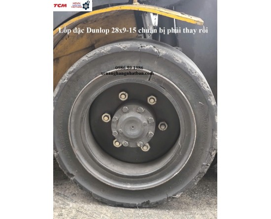 Lốp xe nâng 28x9-15 Dunlop chất lượng cao đã mòn vỡ, cần thay thế sớm