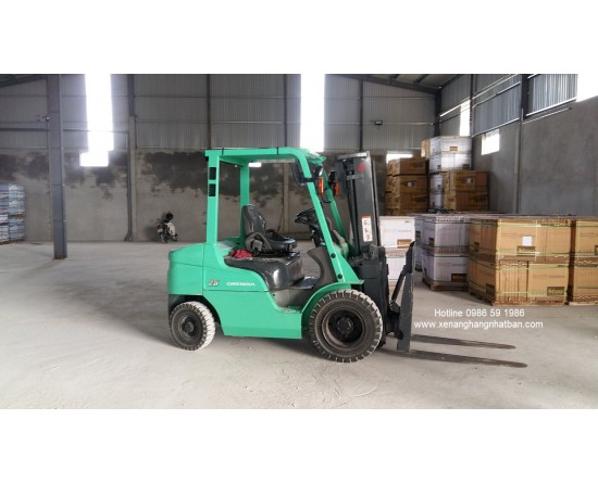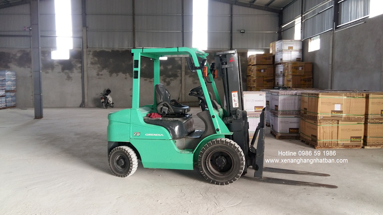 Hình ảnh xe nâng Mitsubishi 2.5 tấn, cao 3 mét có càng gật gù tại kho gạch men TP Ninh Bình