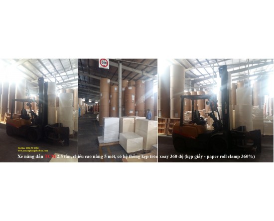 Chú ý khi chọn mua xe nâng hàng gắn kẹp tròn xoay: - Kích thước cuộn giấy (khổ giấy - chiều cao - chiều rộng, đường kính cuộn giấy) - Xếp bao nhiêu cuộn giấy lên nhau ? - Khối lượng của mỗi cuộn giấy ? - Khối lượng của cuộn giấy được xếp cao nhất (ở tầng cao nhất) ? - Nếu mua rời kẹp lắp vào xe đã có sẵn, cần kiểm tra lại xe đã có hệ thống thủy lực, van chờ, tay điều khiển có sẵn chưa