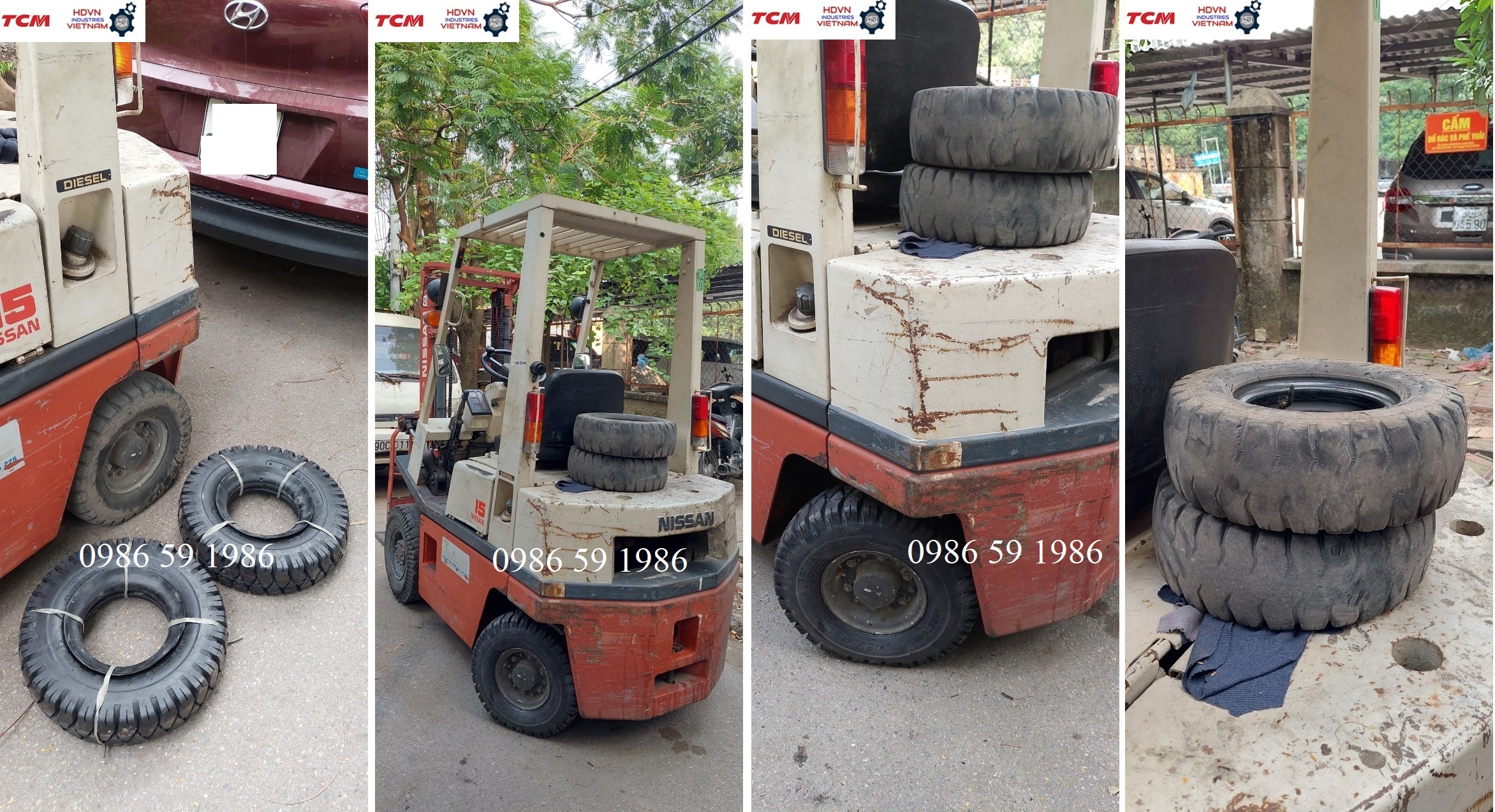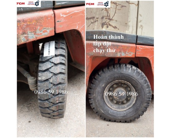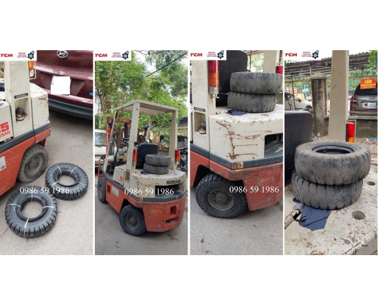 Hình ảnh thay thế lốp hơi 500-8 Deestone cho xe nâng cũ 1.5 tấn Nissan cho xưởng in bao bì tại làng nghề Triều Khúc, Tân Triều, Thanh Trì, Hà Nội